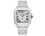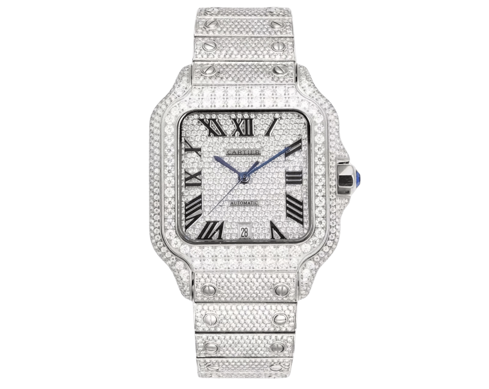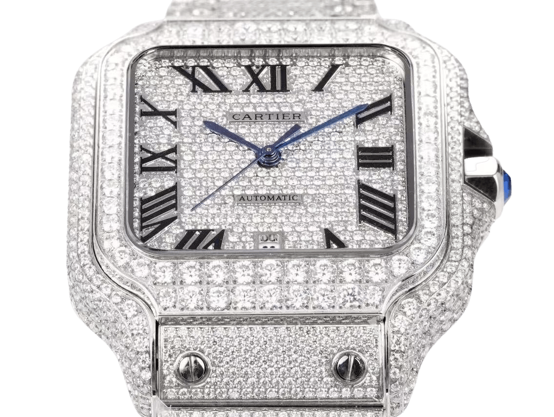 Beautiful moissanite square watch inspired by an iconic luxury design, fully iced with authentic VVS moissanite stones and crafted in 925 sterling silver with a polished silver-tone finish. This statement timepiece features a bold square case, Roman numeral dial, and a fully stone-covered bezel, dial, and bracelet, delivering exceptional brilliance and a premium diamond-like appearance.