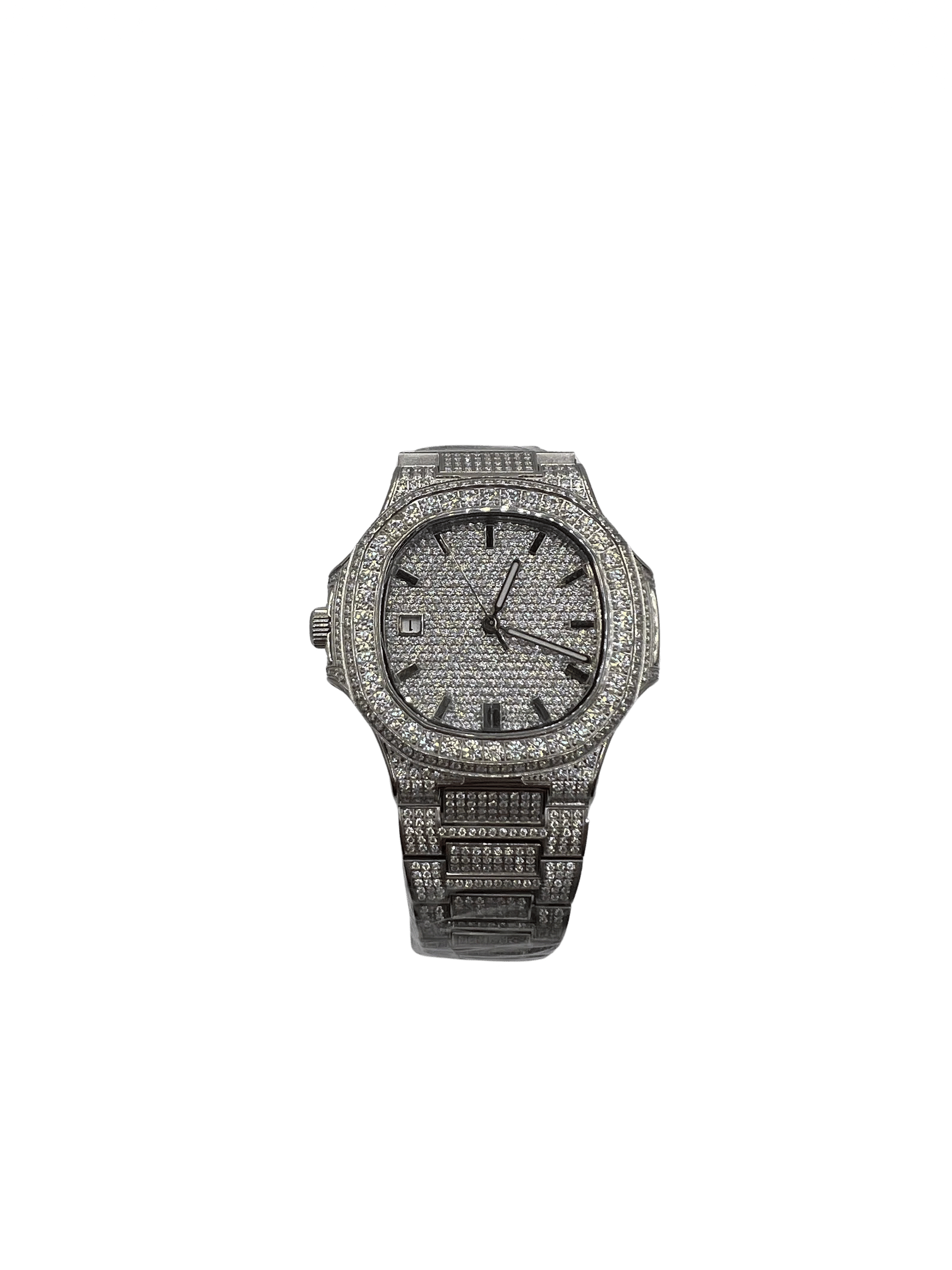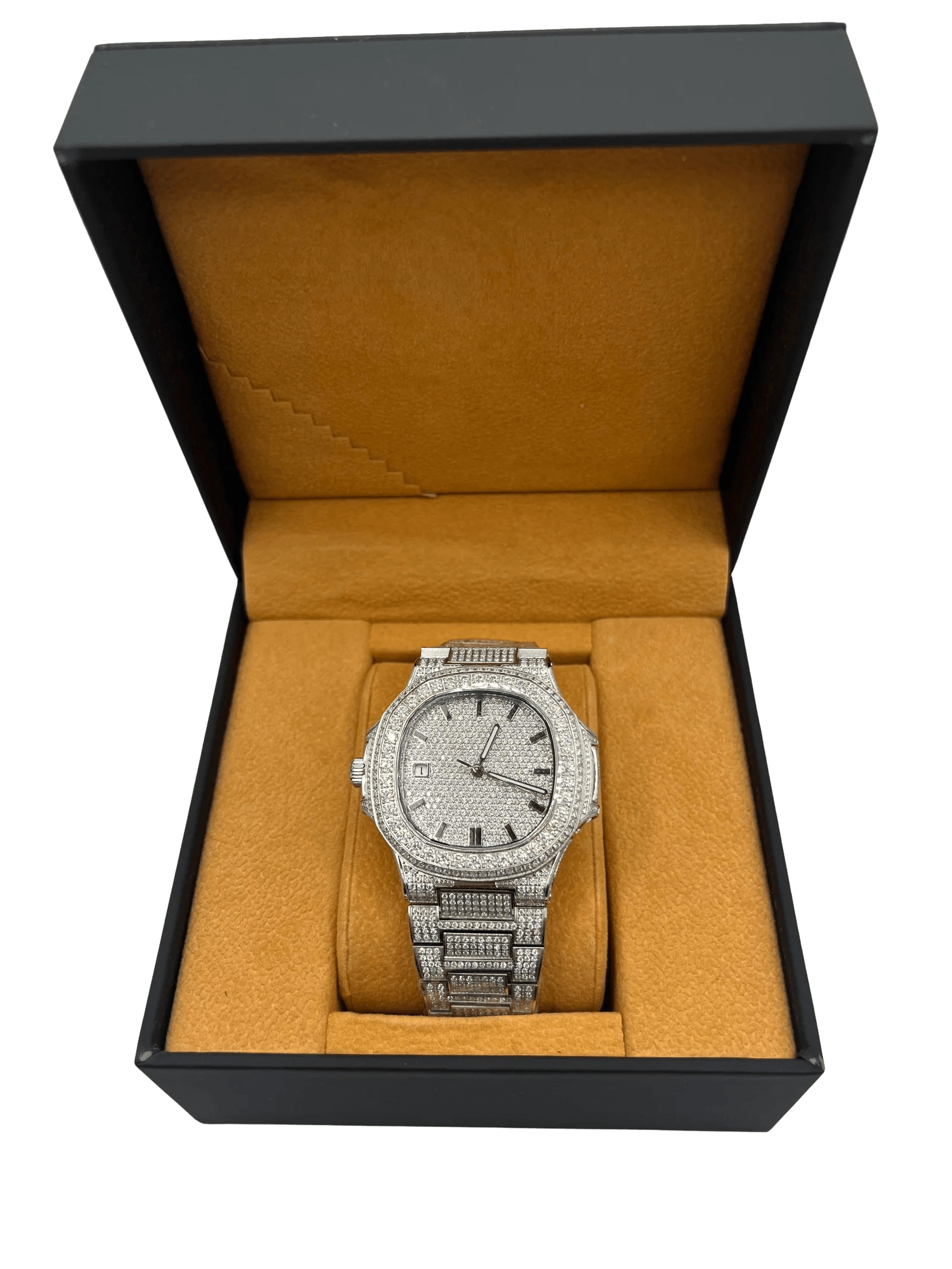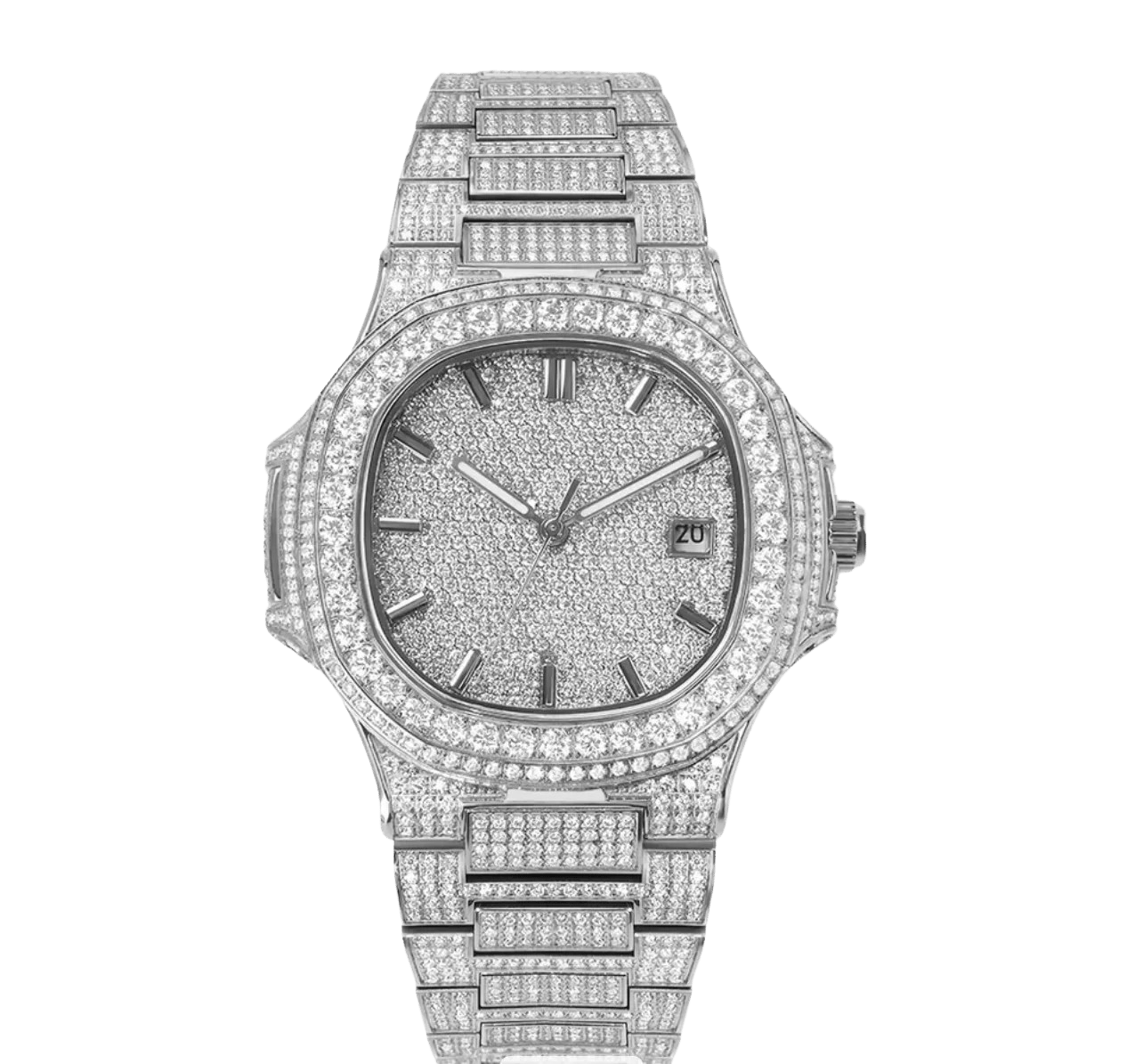 Moissanite is a highly sought-after diamond alternative known for its incredible brilliance, fire, and durability. This watch offers the same eye-catching sparkle as high-end diamond watches while providing excellent durability for everyday wear. High-quality moissanite is also known to pass standard diamond tester devices due to its similar thermal properties, making it one of the most convincing diamond alternatives available.