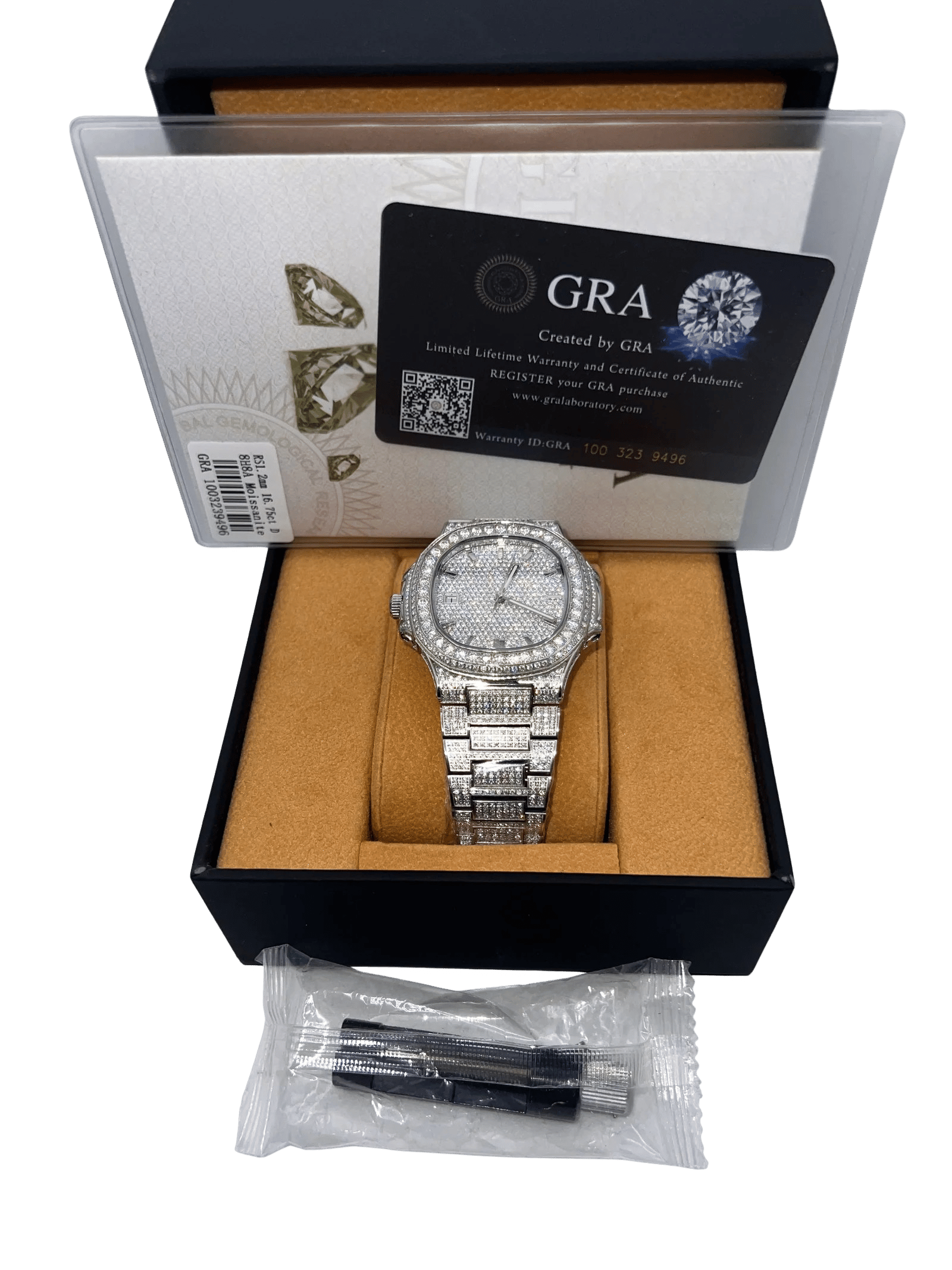 The watch is brand new and comes with the original presentation box. A certificate and warranty card from Global Gemological Research Academy (GRA) is also included, along with a watch adjustment tool for easy sizing.